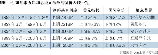从历史数据来看,加息对金价影响有正有负(表2)。当为抑制经济过热的加息,一般金价不降反升,这或与加息驱使资金从泡沫行业流入金市有关。而当前美国的经济形势与表2中第一、三次加息的经济背景较为类似,故预计此次加息将对金价形成压制。