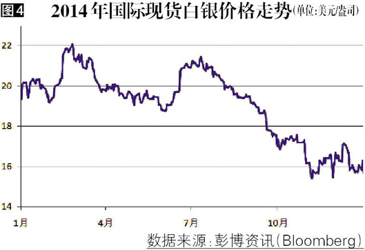 2014年白银价格连续第二年收跌。国际现货白银开于19.47美元/盎司,收于15.71美元/盎司,跌幅19.31%,期间最高价22.18美元/盎司,最低价14.42美元/盎司。金银比价全年持续走高,收于75.66。国内市场方面,上海黄金交易所Ag(T+D)开于4,030元/千克,收于3,447元/千克,跌幅14.06%。