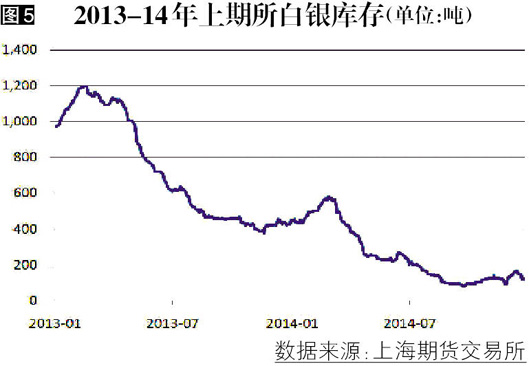 截至2014年5月下旬,我国白银年内消费量已超过2013年全年水平,约6,600吨,分项数据均衡增长,创历史新高。按照线性估算,全年同比上升110%,远超过去十年平均同比增速(12.54%)。而同期国内白银产量及进出口量均保持相对稳定,全年供需面持续趋紧。对照上海期货交易所过去两年白银库存情况,可以验证现货紧张的现象,2013年初,库存从1,200吨的高位快速下降,2014年三季度,库存不足100吨,年末,白银1412合约到期交割,库存也仅微升至130吨左右的水平。