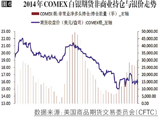 2014年,全球白银ETF持仓量同比基本持平,非常稳定地维持在20,000吨左右的历史高位,波动极小,与银价走势的相关性进一步降低。这与黄金ETF持仓与金价之间的同向变化关系形成强烈对比,说明银价变动和以ETF为代表的资产配置需求变化基本脱节。再者,根据上文所述,我国尽管出现白银供不应求的局面,但仍无法影响到银价的绝对走势。