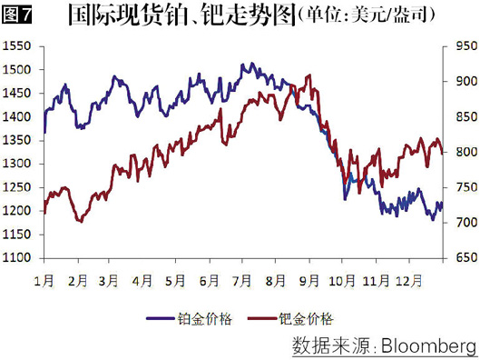 2014国际市场现货铂金价格开于1367.45美元/盎司,收于1208美元/盎司,累计跌幅11.66%。钯金价格开于714.2美元/盎司,收于797.6美元/盎司,累计涨幅11.68%,并于9月12日触及908.4美元/盎司,创下逾10年高点。