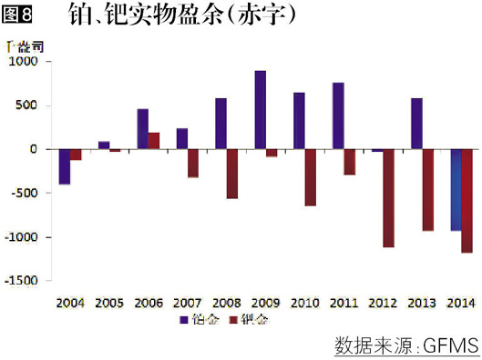 随劳资纠纷平息,2015年南非再度发生大规模罢工的可能性较低,铂系金属矿有望恢复正常生产,由此部分消除供给赤字。西方针对俄罗斯的制裁可能为钯金带来短线行情,但预计不会对供需造成实质影响。需求方面,在全球经济复苏大环境下铂系金属,特别是钯金催化剂需求将保持强劲。然而在强势美元背景下,大宗商品整体承压,投资者兴趣减淡、资金流出大宗商品市场的现象或将不可避免,投资需求,尤其是ETF投资可能萎缩,从而令铂钯市场重回由实需主导的格局。