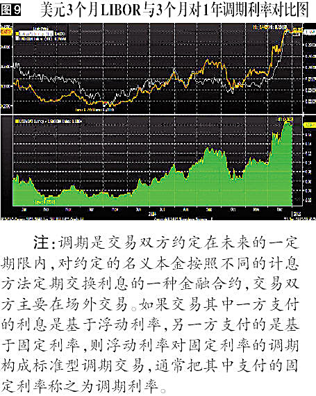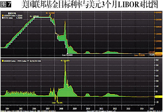2015年就业和工资水平取得更大改善,消费需求开始回升并更有自信、消费者对于价格变化的敏感性也能降低——上面是美联储希望看到的场景,而美联储总是基本能完成自己的目标。国际市场是一个由美联储驱动的市场,无论美联储透露何种信息,市场都不得不跟进,图7是美国联邦基金目标利率与美元3个月LIBOR的对比示意图,清晰地表明美联储在引导市场利率方面的效率,及两者之间的紧密关系。