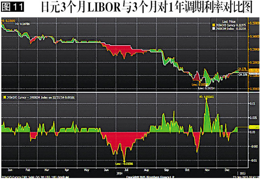 交易指标方面,日元3个月LIBOR 2014年一直低位运行,并逐步下滑,最低值在年末的0.10214,最高值在年初的0.14786;3个月对1年调期利率几乎与3个月LIBOR完全吻合,其最低值在0.105,最高值在0.15。