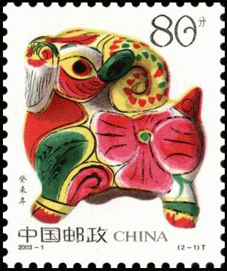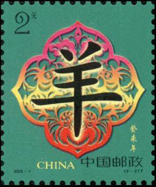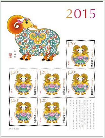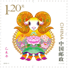 既然生肖文化根植于中华大地,那么中国邮政发行的“乙未年”邮票就更加受到人们的重视。2015年1月5日亮相的“乙未年”邮票,不仅是中国邮政发行的第三轮羊年邮票,同时也是第三轮生肖邮票的收官之作,其设计如何当然就更加引人瞩目。这枚“乙未年”生肖邮票的设计者是清华美院的吴冠英教授,他同时也包揽了第三轮生肖邮票中的兔年和蛇年邮票,但“乙未年”邮票的设计与布局则可谓匠心独具。如邮票上的羊角造型取材于甲骨文的‘羊’字,颇具王者风范,羊角上的缠枝花纹是生生不息的象征,代表着长长久久。羊身上装饰着传统文化中象征富贵的四季花卉,有荷花、梅花、牡丹花、百合花。而身上的蓝色、绿色和紫色装饰的吉祥水纹,则象征着水润财来,因此第三轮羊年邮票也被称为富贵羊。与此同时,生肖邮票中的羊以正面形象而非侧面形象示人,整个形象采用的对称造型,强调了羊稳重而安详的性格,而乙未年是60年一遇的金羊年(砂中金),因此邮票上优雅的羊大角、卷曲的羊毛等部位均使用了特殊的金色油墨。有趣的是,邮票图案中的牡丹花为三层,两侧为12卷羊毛,暗扣我国生肖邮票已发行三轮,每轮12套邮票。