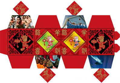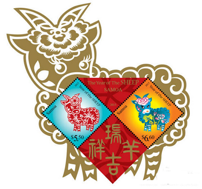 自然,更多的国家或地区则选择了中国著名画家或华裔画家来设计羊年邮票,以尽可能反映出原汁原味的中国传统生肖风韵。像萨摩亚发行的2015年羊年生肖邮票,即邀请著名华裔设计师张向阳操刀,邮票画面上的羊造型则源自古代陶瓷羊的外形特征,在小全张上还特别邀请张世奇书写的“瑞羊吉祥”,羊嘴衔着灵芝,体现了瑞、祥、康、寿的美好祝福。异形边纸,羊中有羊,金红相映,喜气洋洋,菱形邮票的外框以钻石形围绕,钻石形中又巧妙地融入了菱形挥春的元素,钻石在西方诠释财富,挥春则籍中国传统传达祝福,邮票与边纸相得益彰,相映成趣。