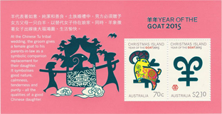 澳大利亚于1月8日发售中国羊年邮票,设计者特为选择墨尔本华裔女平面设计师潘德妮,因为多利亚人认为羊是最为女性化的形象,非常温驯、诚恳、胆小和害羞。这次设计中凸显羊年女性气质的地方,除了采用粉彩色系之外,还有小型张上的中国传统习俗典故。根据小型张上使用中英文双语所写,“土族婚礼中,男方必须赠予女方父母一只白羊,以替代女子住在娘家。同时,羊象征着女子出嫁后大福鸿图,生活愉快”。这种布局十分去巧妙,将澳大利亚的土族习俗融入其间,令人有一种穿越的味道。