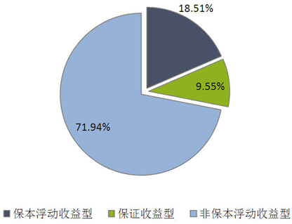 从收益类型来看,保证收益型产品发行了342款,环比减少194款,市场占比下降2.17个百分点至9.55%;保本浮动收益型产品发行了663款,环比减少25款,市场占比上升3.47个百分点至18.51%;非保本浮动收益型产品发行了2576款,环比减少773款,市场占比下降1.30个百分点至71.94%。(图1)