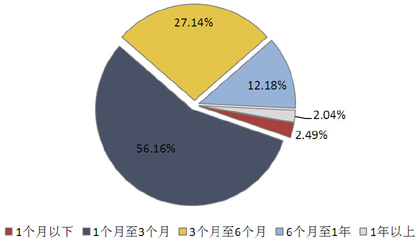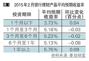 从银行间市场资金面来看,受春节假期因素影响,本月短期资金利率出现上涨,1个月及其以下的SHIBOR利率普遍为逐步上涨态势,而3个月以上中长期利率则有所下降。银行理财产品的发行收益率与SHIBOR利率的走势呈正相关关系:1个月以下期限类型理财产品的平均预期收益率较上月小幅上涨,而1-3个月、3-6个月、6-12个月期限类型出现下跌。(表1)