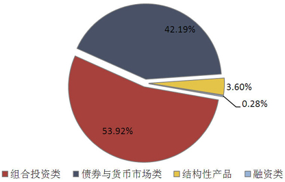 从投向类型来看,债券与货币市场类产品发行了1511款,环比减少529款,市场占比下降2.41个百分点至42.19%;组合投资类产品发行了1931款,环比减少344款,市场占比上升4.17个百分点至53.92%;融资类产品发行了10款,环比减少13款,市场占比下降0.22个百分点至0.28%;结构性产品发行了129款,环比减少106款,市场占比下降1.54个百分点至3.60%。(图4)