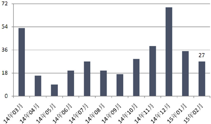 由于春节因素,本月共有48家信托公司发行了371款集合信托产品,发行数量环比减少278款,降幅42.84%。这个数量仍然高于去年同期75.83%。(图5)