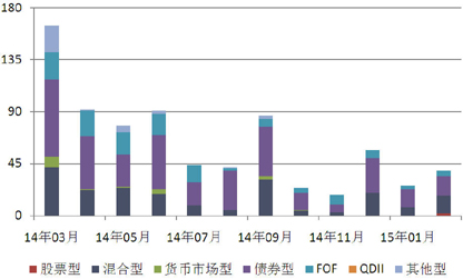 本月,7家证券公司或其资管公司发行了39款券商理财产品,环比增加13款,增幅50.00%,平均首发目标规模17.15亿元,环比上升6.14亿元,增幅55.77%。其中,债券型产品发行了17款,环比增加1款,增幅6.25%,平均首发目标规模5.97亿元,环比减少8.37亿元,降幅58.36%;混合型产品发行了15款,环比增加8款,增幅114.29%,平均首发目标规模31.30亿元;FOF产品发行了5款,环比增加2款,增幅66.67%,平均首发目标规模0.32亿元,环比减少0.55亿元,降幅62.87%;股票型产品发行了2款,平均首发目标规模50.00亿元。这是自2013年12月来,股票型产品首次发行。(图9)