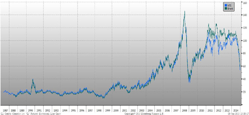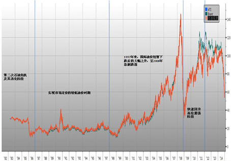 WTI和BRENT历史走势图(1987-2014)