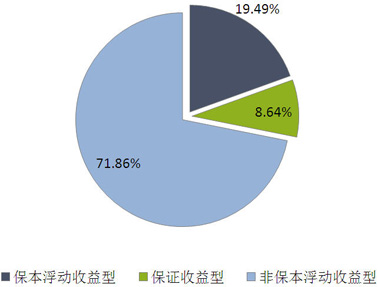从收益类型来看,保证收益型产品发行了439款,环比增加97款,市场占比下降0.91个百分点至8.64%;保本浮动收益型产品发行了990款,环比增加327款,市场占比上升0.98个百分点至19.49%;非保本浮动收益型产品发行了3650款,环比增加1074款,市场占比下降0.07个百分点至71.86%。(图1)