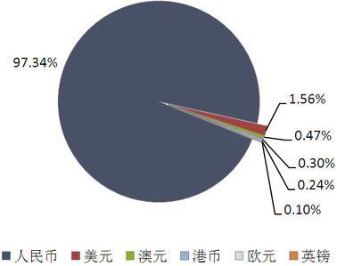 从投资币种来看,人民币产品发行了4944款,环比增加1471款,市场占比上升0.36个百分点至97.34%;美元产品发行了79款,环比增加20款,市场占比下降0.09个百分点至1.56%;澳元产品发行了24款,环比增加5款,市场占比下降0.06个百分点至0.47%;港币产品发行了15款,环比增加1款,市场占比下降0.10个百分点至0.30%;欧元产品发行了12款,环比增加2款,市场占比下降0.04个百分点至0.24%;英镑产品发行了5款,环比减少1款,市场占比下降0.07个百分点至0.10%。(图2)