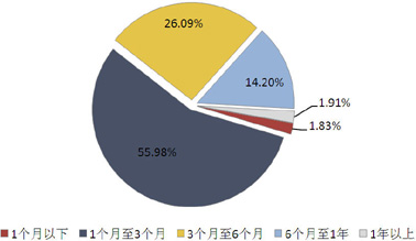 从投资期限来看,1个月以下产品发行了93款,环比增加4款,市场占比下降0.65个百分点至1.83%;1-3个月产品发行了2843款,环比增加832款,市场占比下降0.18个百分点至55.98%;3-6个月产品发行了1325款,环比增加353款,市场占比下降1.06个百分点至26.09%;6-12个月产品发行了721款,环比增加285款,市场占比上升2.02个百分点至14.20%;1年以上产品发行了97款,环比增加24款,市场占比下降0.13个百分点至1.91%。(图3)