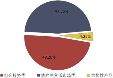 从投向类型来看,债券与货币市场类产品发行了2415款,环比增加904款,市场占比上升5.35个百分点至47.55%;组合投资类产品发行了2448款,环比增加517款,市场占比下降5.73个百分点至48.20%;结构性产品发行了216款,环比增加87款,市场占比上升0.65个百分点至4.25%;融资类产品没有发行。(图4)