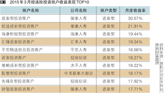截至2015年3月底,在运行的投连险投资账户共计184个,所有投资账户的月度平均收益率为8.31%,创近七年来单月新高,主要因素在于A股市场的火爆行情。
