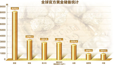 相比很多国家,中国黄金占外汇储备比例偏低。中国持有的黄金占其外汇储备总额的比例,远低于10%左右的全球平均水平。根据世界黄金协会(WGC)2014年7月公布的数据,中国目前黄金储备只有1054.1吨,占外汇储备的比重仅为1.6%。而德国是71.7%,美国高达74.7%,连俄罗斯和印度等新兴国家也都在5%以上。2014年第四季墨西哥为2.4%,澳大利亚为5.7%,印度为6.7%,俄罗斯为12.1%。