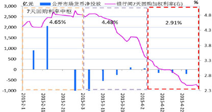 2015年4月资金面较3月明显转松,7天回购利率月度中枢为2.91%,较3月的4.48%大幅下降157bps。在4月上旬和下旬,7天回购利率的下降速度较快,主要受资金回流以及央行在公开市场上调降7天逆回购利率10bps至3.45%影响,以及央行超预期宣布自4 月20 日起下调各类存款类金融机构人民币存款准备金率1%,并搭配定向降准;而中旬受IPO发行提速以及企业缴税规模较大影响,7天回购利率的下降速度减慢。(图5)