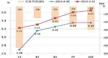 经济疲弱,央行货币政策定向宽松的基调不变,预计5月还可能有宽松政策出台,在中央鼓励直接融资、降低社会融资成本的政策驱动下,信用债的收益率还将继续下行。由于资金面宽松,短端收益率相对长端有较大的下行空间,收益率曲线陡峭化下行的概率较大。