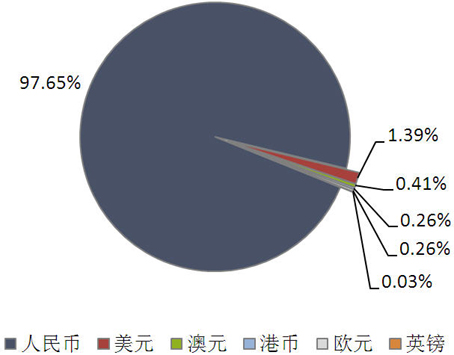 从投资币种来看,人民币产品发行了5688款,环比增加744款,市场占比上升0.31个百分点至97.65%;美元产品发行了81款,环比增加2款,市场占比下降0.16个百分点至1.39%;澳元产品发行了24款,环比保持不变,市场占比下降0.06个百分点至0.41%;港币产品发行了15款,环比保持不变,市场占比下降0.04个百分点至0.26%;欧元产品发行了15款,环比增加3款,市场占比上升0.02个百分点至0.26%;英镑产品发行了2款,环比减少3款,市场占比下降0.06个百分点至0.03%。(图2)