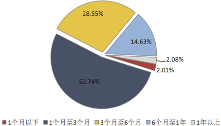 从投资期限来看,1个月以下产品发行了117款,环比增加24款,市场占比上升0.18个百分点至2.01%;1-3个月产品发行了3072款,环比增加229款,市场占比下降3.24个百分点至52.74%;3-6个月产品发行了1663款,环比增加338款,市场占比上升2.46个百分点至28.55%;6-12个月产品发行了852款,环比增加131款,市场占比上升0.43个百分点至14.63%;1年以上产品发行了121款,环比增加24款,市场占比上升0.17个百分点至2.08%。(图3)