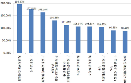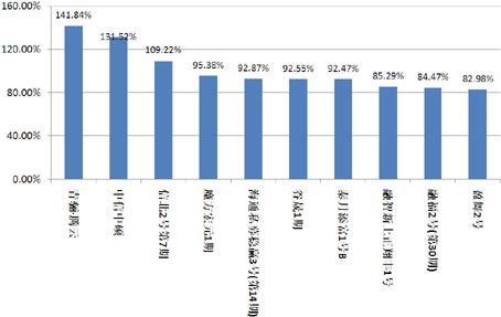 本月共有182个获得正收益率,其中包括保守型32个、稳健型57个、平衡型42个、进取型51个。以上四类投资账户的月度平均收益率依次为0.80%、4.50%、10.10%和12.70%。月度收益表现最好的10个投资账户全部为进取型,排名首位的是光大永明的策略投资账户。(表2)
