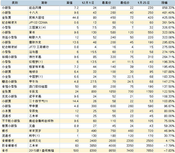 具体到品种,目前1992年之后发行的小型张和小全张已全线上涨,且成交量也在快速放大,虽然这其中有不少品种是受到交易所托管挂牌的刺激而逞强,但有更多的品种却在卖家的强力吸纳下,呈现大幅走高趋势,市场的抢筹意识浓郁。其中“世纪宝鼎”、“水浒(5)”、“大足石刻”、“龙虎山”和“诸葛亮”小型张分别上扬到4200元、3700元、3000元、2200元和2500元,“聊斋(1)”、“宝鼎”、“二滩水电站”、“八仙过海”、“挥扇仕女图”和“九龙壁”小型张整盒价分别扬升至2600元、4100元、7700元、98000元、4000元和9500元,“春节”、“九寨沟”、“邮联四大”、“洛阳世展”和“三国演义(5)”型张整盒价格分别在2400元、2100元、1700元、3900元和3200元,而“兜兰”、“桃花坞年画”、“炎帝陵”、“民运会”和“杨家埠年画”小全张整盒市价分别为3950元、6800元、3000元、1900元和9800元,“中国梦(1)”、“中国梦(2)”和“羊年贺喜”小全张分别扬升至70元成交、35元和65元,“红楼梦(1)”、“捣练图”、“西游记(1)”、“浴马图”和“唐卡”小型张分别走高到25元、50元、28元、55元和30元。