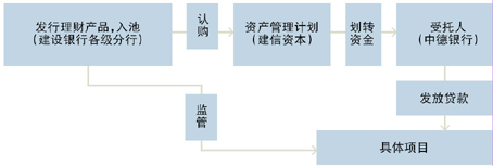 联动分行、子公司,为客户提供更多资金支持。建设银行各级分行拟提供资金支持的项目通过审批后,由建设银行各级分行发行理财产品申请纳入总行资金池,资金用于购买建信资本管理有限责任公司发行的资产管理计划。建信资本管理有限责任公司专项资产管理计划成立后,通过中德银行向建设银行各级分行管辖客户发放委托贷款,为建设银行客户的具体项目提供资金支持。(见图表)