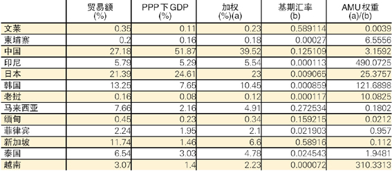 表1 东盟+中、日、韩13国货币在AMU中的权重