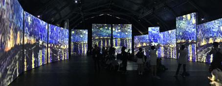 “不朽的梵高”感映艺术展,不同以往传统的展览,此次展览采用了最新的感映技术,将多媒体画廊与度身定制的展厅巧妙结合,通过3000多幅画面向观众讲述了这位不朽画家的坎坷人生和天才创作。其实,这个展览也是存在争议的,因为它太不一样,很多人以为可以亲眼目睹梵高的真迹,但是期望终落空,整个展览没有一副真迹,也根本不可能像传统展一样去欣赏大师作品的细节。有人说这是亵渎艺术,但也有人乐在其中。如果单纯的作为一个观展者,我的心里是有失落有惊喜的,从一开始进入展厅的失落与焦躁,到后来席地而坐,静下心来看了一遍又一遍。梵高的画在我眼前、身后甚至脚下,动了起来,伴随着同时代的交响乐,看着梵高生前的书信,我想,这是我最近距离的一次与梵高“对话”,他变得不再像以前那么遥远,他的作品冲出了框架的束缚,虽然在内容上是入门级别的,但是这短短35分钟的循环播放,把我们带到了梵高的世界,我们似乎能感受到他当时的心情,感受他的喜怒哀乐,甚至能感觉到他被疾病折磨仍不想放弃绘画时的挣扎,病情的反复,生活的困窘,让人心疼,最后麦田上飞起的一片片乌鸦,让人绝望到窒息。从K11莫奈画展到新天地梵高画展,对于艺术商业化的争论一直未停,从我个人角度出发,无论是博物馆还是商业场所,艺术本身的魅力是无穷的。