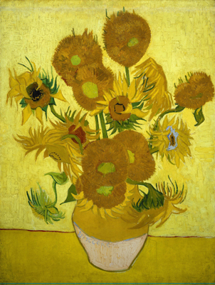 1886年夏天梵高第一次画向日葵。两年以后他在阿尔勒,也就是普罗旺斯地区的马赛北部定居,他的兴趣重又燃起。他请来他崇拜的法国后现代派画家保罗·高更加入他的南方画室,此后便开始在粉刷得雪白的室内墙壁上画向日葵,以此增添些许亮色。高更接受了梵高的邀请,却不太情愿。此时这位荷兰人便开始绘制那四幅向日葵原作中的后两幅,好等秋天客人到来以后放在他朴素的卧室里。“梵高为高更的卧室创作了向日葵,他希望籍此为饵,把他的朋友从布列塔尼引诱过来”贝利说。《向日葵》在今天仍是美术史上最受欢迎的一幅静物画,一幅以植物为题的《蒙娜丽莎》。