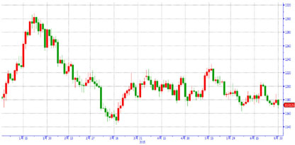 2015年上半年国际黄金市场走势可分为两个阶段:一季度尖顶形态,二季度低位盘整。