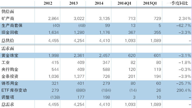 2015年一季度全球黄金需求总量1079.3吨,同比下降1%,环比增长2.8%,主要是受投资需求拉动。