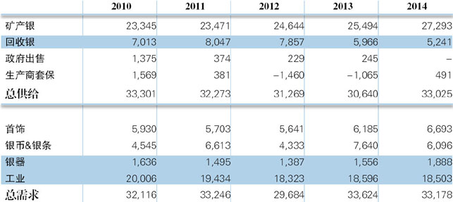 受限于近三年贵金属和基本金属市场弱势格局,前期矿企产能扩张已基本完成,预计2015年矿产银增速将会明显放缓,同时回收银供给将继续维持疲弱。