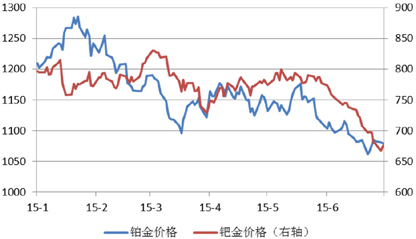 2015年国际市场现货铂金价格开于1209.65美元/盎司,6月30日收于1078.93美元/盎司,累计跌幅10.81%。钯金价格开于797美元/盎司,收于675.5美元/盎司,累计跌幅15.24%。铂钯走势都弱于金银。(图3)