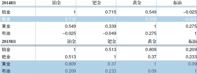 今年以来,铂、钯价格走势与基本面背离,与其他大宗商品的相关性也出现变化。具体而言,一是与黄金相关性大幅增强,尤其是铂金,与黄金相关性超过80%,去年同期仅为54.9%;二是与原油之间的负相关性消退。铂钯主要工业用途为汽车尾气催化剂,因低油价有利于降低汽车使用成本从而利好销售,促进汽车尾气催化剂增长,铂钯价格一般与原油呈负相关。然而今年上半年,铂钯走势与BRENT原油呈正相关,显示市场买兴缺失,铂钯走势跟随黄金和其他大宗商品,而非根据基本面情况走出独立行情。