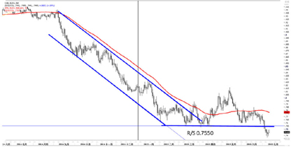 澳元对美元2015年上半年开于0.8161,收于0.7704,累计贬值5.6%。 澳元对美元上半年基本是在低位震荡,区间是在【0.75,0.82】。1-3月份澳元表现低迷,从0.81最低跌至0.75,4-5月份美元表现疲弱,澳元反弹至0.80附近,但之后澳元一路下跌,再度触及0.76的低位。经济基本面方面,在全球经济增长现状和前景不佳的情况下,以铁矿石等商品出口为导向的澳大利亚经济遭受到严重冲击,矿业投资、消费和劳动力市场均因此受到伤害。澳大利亚一季度GDP年率下降到2.3%的水平,经济增速继续放缓;失业率维持在6%左右的较高水平,就业人数增长乏力;1至5月的贸易帐全部录得逆差,且表现出持续恶化的趋势。货币政策方面,澳洲联储曾数次表态“澳元有必要进一步贬值以达到经济均衡增长目标”,并在2月3日和5月5日分别降息25个基点,将基准利率降到2.0%的水平,进一步支持了澳元的走弱。澳大利亚经济受中国的影响较大,而中国经济在2015年继续面临下行压力。此外,考虑到澳央行为改善疲弱的经济状况可能采取进一步降息的措施以及对澳元贬值持有的容忍态度,预计澳元对美元下半年仍将承压。预计波动区间为【0.70,0.80】。(图6)