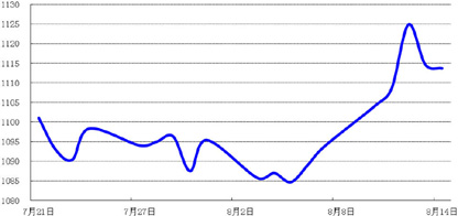 上周,人民币的大幅贬值提振了市场避险情绪,令投资者对美联储将于9月加息的预期降温,带动国际金价回涨,周五收盘于1113.7美元/盎司,较前一周上涨1.82%。