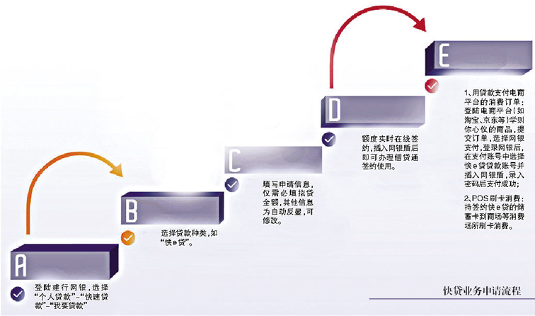 “快贷”依托于互联网平台,通过建行网上银行自助操作的信用贷款。针对有按揭贷款房屋抵押的客户,还提供了大额抵押贷款等产品,同样可以实现在线申请、在线审批,客户只需要到线下一次办理签约、抵押登记等手续即可。此外,针对在建行有定期存款、电子国债、理财产品等可以质押的资产的客户,也可在网上全流程自助办理质押贷款,从而盘活金融资产,客户也可以随时还款等,也无需再到网点。