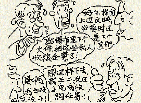 有人出主意,因为有“别人”在买粮,所以国家的粮库收不到粮食,不如把那些私粮贩子给禁了。于是一个个规定相继出台,开始打击私人粮贩。