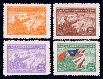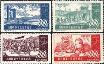 1952年,中国邮政就发行了编号为纪16的《抗日战争15周年纪念》邮票,全套4枚,名称分别为“卢沟桥风云”、“平型关胜利”、“欢送新四军抗日”和“领袖策划反攻”。从发行日期看,此套邮票以1937年7月7日的“卢沟桥事变”为时间点,反映了抗日战争8年的历史片段。不过,13年后的1965年所发行的《纪念抗日战争胜利二十年》则将发行日期移至1945年9月3日的“胜利日”窗口,显示了邮票发行的思维已从“事变日”改为“胜利日”,而这也与国际上的胜利纪念日相吻合。