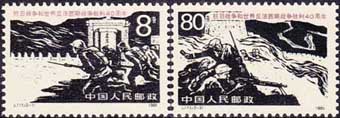 由于“文革”的原因,邮票发行的固有计划遭到破坏。直到“改革开放”后的1985年,《抗日战争和世界反法西斯战争胜利四十周年》邮票再度发行,2枚邮票的内容分别是“卢沟桥中国军队奋起抗日”和“八路军和民兵战斗在长城内外”,此套邮票也是“抗战”邮票中规格最低的。(1张)由于“文革”的原因,邮票发行的固有计划遭到破坏。直到“改革开放”后的1985年,《抗日战争和世界反法西斯战争胜利四十周年》邮票再度发行,2枚邮票的内容分别是“卢沟桥中国军队奋起抗日”和“八路军和民兵战斗在长城内外”,此套邮票也是“抗战”邮票中规格最低的。