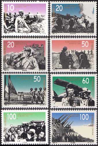 1995年9月3日发行的《抗日战争和世界反法西斯战争胜利五十周年》邮票规格明显提升,全套增至8枚,内容分别为““七·七”战火”、“ 台儿庄大捷”、“百团大战”、“敌后游击队”、“芒友会师”、“华侨捐献”、“台湾光复”和“伟大胜利”。从内容上看,增加了不少题材,涉及面扩大,反映了对“抗日战争”的认识更加宽泛。