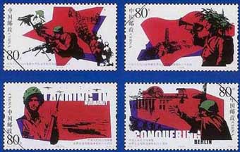 2005年发行的《抗日战争和世界反法西斯战争胜利六十周年》邮票,全套4枚,另发行小型张,规格再次提升。值得留意的是,这套邮票的发行日期改至8月15日,主要是邮票所反映的内容首次扩大至世界范围,分别为“全面抗战”、“中流砥柱”、“诺曼底登陆”和“攻克柏林”,小型张名称为“和平与正义”。这也是我国“抗战”邮票涉及内容走出国内,迈向世界。