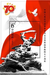 2015年9月3日,《抗日战争和世界反法西斯战争胜利七十周年》邮票以13枚邮票和1枚小型张组成,是迄今为止全套枚数最多、规格最高的一套抗战胜利题材邮票,具有很强的现实意义。全套邮票以国内13个“抗日战争”纪念馆为主图,以抽象的手法描绘了8年抗战中的重大历史事件。小型张的画面是以《大刀进行曲》的雕塑、长城、红绸、和平鸽为主要元素,利用红、白、灰色调形成强烈的色彩反差和视觉冲击,现实主义的雕塑凝聚了抗日决心及全国民族为胜利而欢呼的喜悦之情,与中国人民抗日战争暨世界反法西斯战争胜利70周年纪念活动的标识相呼应。与此同时,这套邮票还发行了小版张,其边纸上恰恰出现了纪念日当天的阅兵元素,可谓画龙点睛。