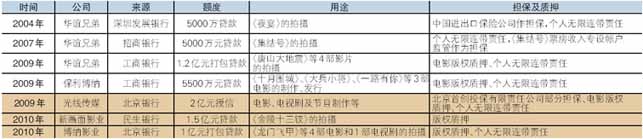 银行贷款是电影市场上常见的融资形式。经典案例有:深圳发展银行为《夜宴》提供为期两年的5000万元贷款、招商银行为《集结号》提供5000万元的贷款、广州发展银行为《功夫之王》提供6500万元贷款等。