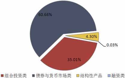 从投向类型来看,债券与货币市场类产品发行3794款,环比增加799款,市场占比上升4.65个百分点至60.66%;组合投资类产品发行2190款,环比增加91款,市场占比下降4.24个百分点至35.01%;结构性产品发行269款,环比增加15款,市场占比下降0.45个百分点至4.30%;融资类产品发行2款,环比增加2款,市场占比上升0.03个百分点至0.03%。(图4)