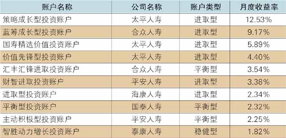 本月共有83个获得正收益率,其中包括保守型32个、稳健型39个、平衡型5个、进取型7个。以上四类投资账户的月度平均收益率依次为0.21%、0.09%、-1.30%和-1.84%。月度收益表现最好的10个投资账户中,进取型6个,平衡型3个,稳健型1个,排名首位的是太平人寿的策略成长型投资账户。(表2)